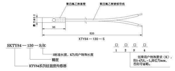 三、技术参数 3.1、绝缘电阻≥100MΩ 3.2、引线材料0.35mm聚四氟乙烯高温线 3.3、典型外形尺寸及型号示例